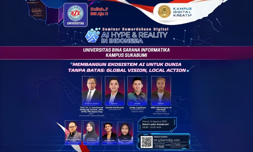 Sukabumi — Di tengah euforia teknologi kecerdasan buatan (AI) yang ramai dibicarakan sebagai tren global, Universitas Bina Sarana Informatika (UBSI) Kampus Sukabumi mengambil langkah konkret lewat penyelenggaraan Seminar Kemerdekaan Digital bertajuk “AI Hype & Reality in Indonesia”. Seminar akan digelar pada Kamis, 14 Agustus 2025, di Hotel Laska Sukabumi ini mengusung tema “Membangun Ekosistem AI untuk Dunia Tanpa Batas: Global Vision, Local Action”.