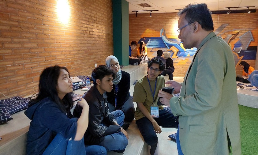 Dalam suasana yang informal namun tetap produktif, Dr. Agus berdiskusi langsung dengan para mahasiswa, menyimak ide mereka, memberi saran pengembangan produk digital, serta mendorong mereka agar selalu memprioritaskan dampak sosial dari solusi teknologi yang dirancang.