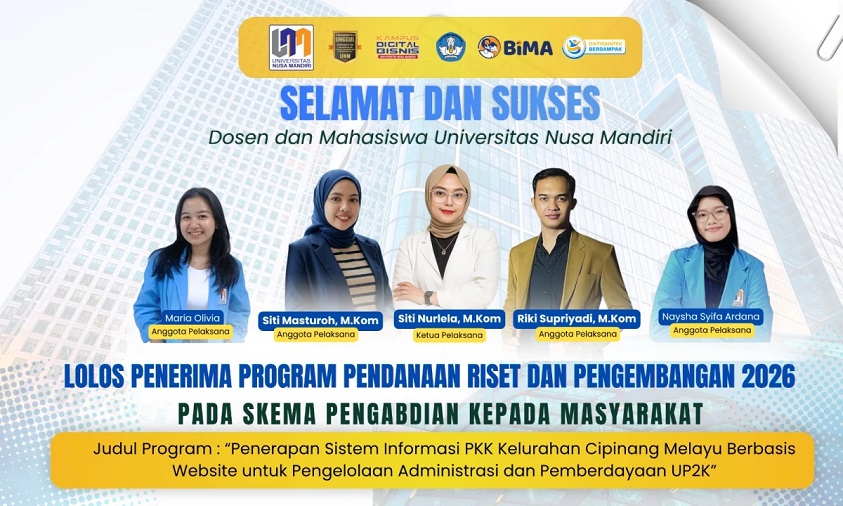 Jakarta — Prestasi membanggakan kembali ditorehkan Universitas Nusa Mandiri (UNM) sebagai Kampus Digital Bisnis. Kali ini, kolaborasi dosen dan mahasiswa UNM berhasil lolos dalam Program Pendanaan Riset dan Pengabdian Tahun 2026, melalui inovasi digital yang menyasar langsung kebutuhan masyarakat.