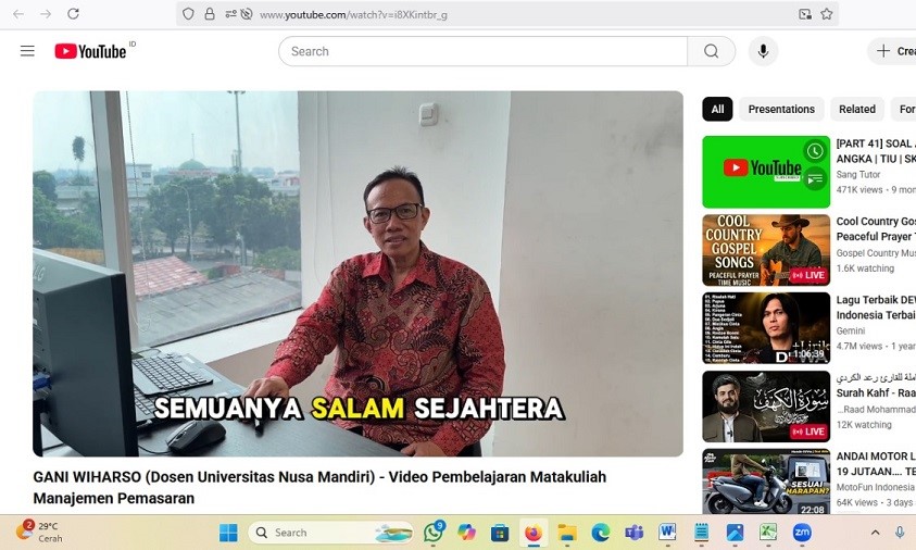 Jakarta – Di tengah derasnya arus transformasi digital dalam dunia pendidikan, semangat untuk terus belajar dan berinovasi ditunjukkan oleh Gani Wiharso, dosen Program Studi Bisnis Digital Universitas Nusa Mandiri (UNM), yang dikenal sebagai Kampus Digital Bisnis. Dalam usianya yang tidak lagi muda, Gani Wiharso justru memilih untuk tampil adaptif dengan mengunggah video pembelajaran mata kuliah Manajemen Pemasaran di kanal YouTube pribadinya.