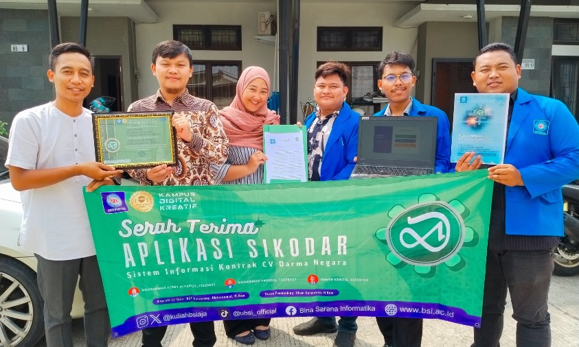 Karawang — Komitmen mahasiswa Universitas Bina Sarana Informatika (UBSI) Kampus Karawang dalam mendukung transformasi digital di sektor industri kembali diwujudkan melalui karya aplikatif berbasis web. Pada Selasa (12/7) silam, telah dilakukan serah terima aplikasi Sikodar (Sistem Informasi Kontrak CV Darma Negara) kepada pihak perusahaan, yang diwakili langsung oleh Syeli Fajri Isnayni, selaku Direktur CV Darma Negara.