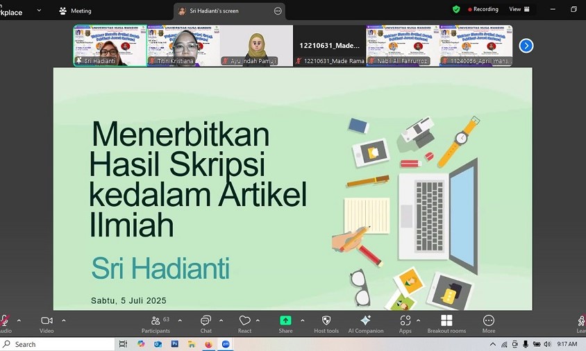 Jakarta – Komitmen Universitas Nusa Mandiri (UNM), yang dikenal sebagai Kampus Digital Bisnis, dalam mendorong budaya akademik dan publikasi ilmiah kembali diwujudkan melalui kegiatan webinar bertajuk “Menulis Artikel Ilmiah untuk Publikasi di Jurnal Nasional”. Kegiatan ini diselenggarakan oleh Fakultas Teknologi Informasi (FTI) pada Sabtu 5 Juli 2025, sebagai bagian dari program pengembangan kapasitas akademik bagi mahasiswa dan dosen.