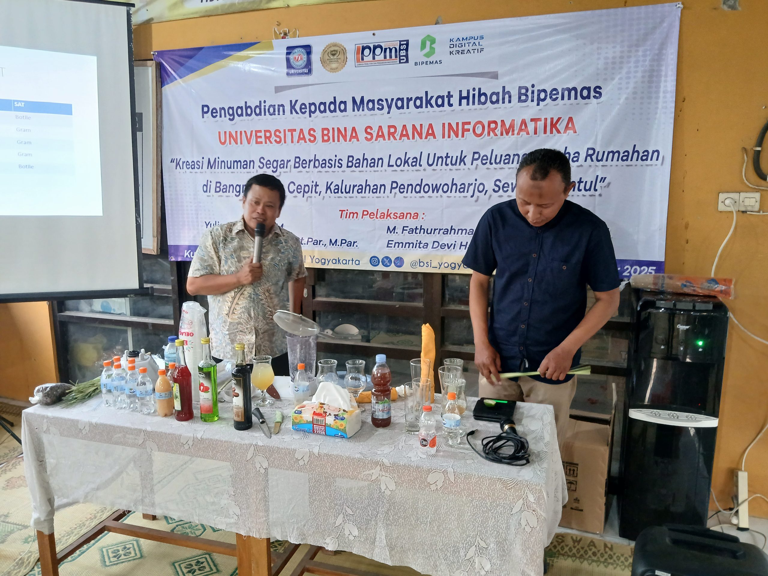 Kegiatan ini menghadirkan narasumber Fathurrahman Nurul Hakim salah satu dosen Prodi Parwisata Universitas Bina Sarana Informatika dan juga seorang praktisi sekaligus pelaku usaha kuliner kreatif yang telah berpengalaman dalam mengembangkan produk minuman berbasis bahan-bahan lokal. Dalam pelatihan ini, beliau berbagi pengetahuan dan keterampilan mengenai cara menciptakan berbagai varian minuman segar yang tidak hanya lezat dan sehat, tetapi juga memiliki nilai jual tinggi serta potensi untuk dikembangkan menjadi usaha rumahan yang berkelanjutan.