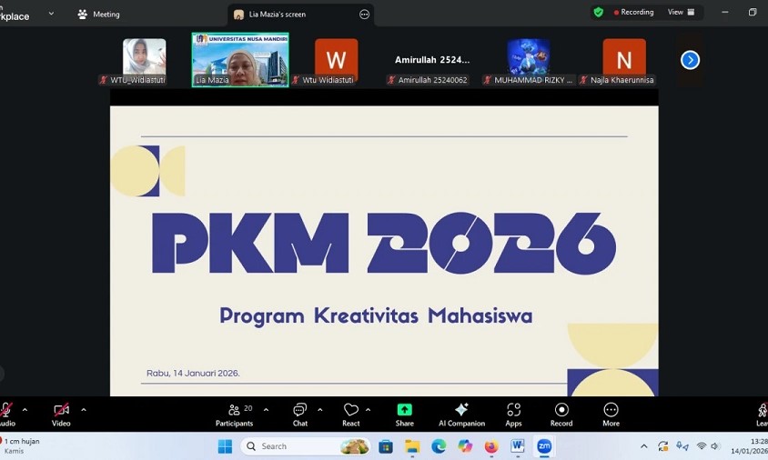 Depok – Program Studi Bisnis Digital Universitas Nusa Mandiri (UNM) menggelar rapat persiapan penyusunan proposal Program Kreativitas Mahasiswa (PKM) dan Program Pembinaan Mahasiswa Wirausaha (P2MW), Rabu (14/1). Kegiatan yang berlangsung secara daring ini menjadi langkah awal memperkuat kesiapan mahasiswa menghadapi kompetisi hibah nasional.
