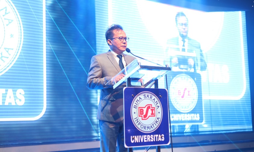 Prof Dr Toni Toharudin memulai sambutannya dengan mengungkapkan rasa terima kasih yang mendalam kepada Universitas BSI dan semua pihak yang telah berperan dalam suksesnya acara wisuda ini.
