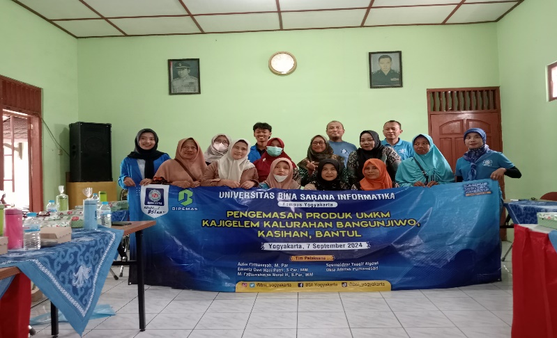 Program Studi Perhotelan Universitas Bina Sarana Informatika (BSI) Kampus Yogyakarta mengadakan kegiatan Pengabdian Kepada Masyarakat (PKM) dengan tema “Pelatihan Pengemasan produk UMKM” di Kelurahan Bangunjiwo, Kecamatan Kasihan, Kabupaten Bantul, Yogyakarta. Acara ini diselenggarakan dalam upaya meningkatkan kualitas pengemasan produk UMKM di desa Prima dan UMKM di Kelurahan Bangunjiwo.