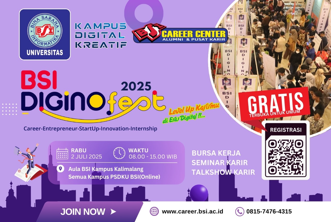 Mengusung tema “Revolusi Dunia Kerja!”, BSI DIGINOFEST 2025 akan diselenggarakan pada Selasa, 2 Juli 2025, dengan format hybrid, yaitu offline di Aula UBSI Kampus Kalimalang dan online secara nasional. Konsep ini dihadirkan untuk menjangkau lebih banyak peserta dari berbagai wilayah Indonesia, tanpa harus datang langsung ke lokasi.