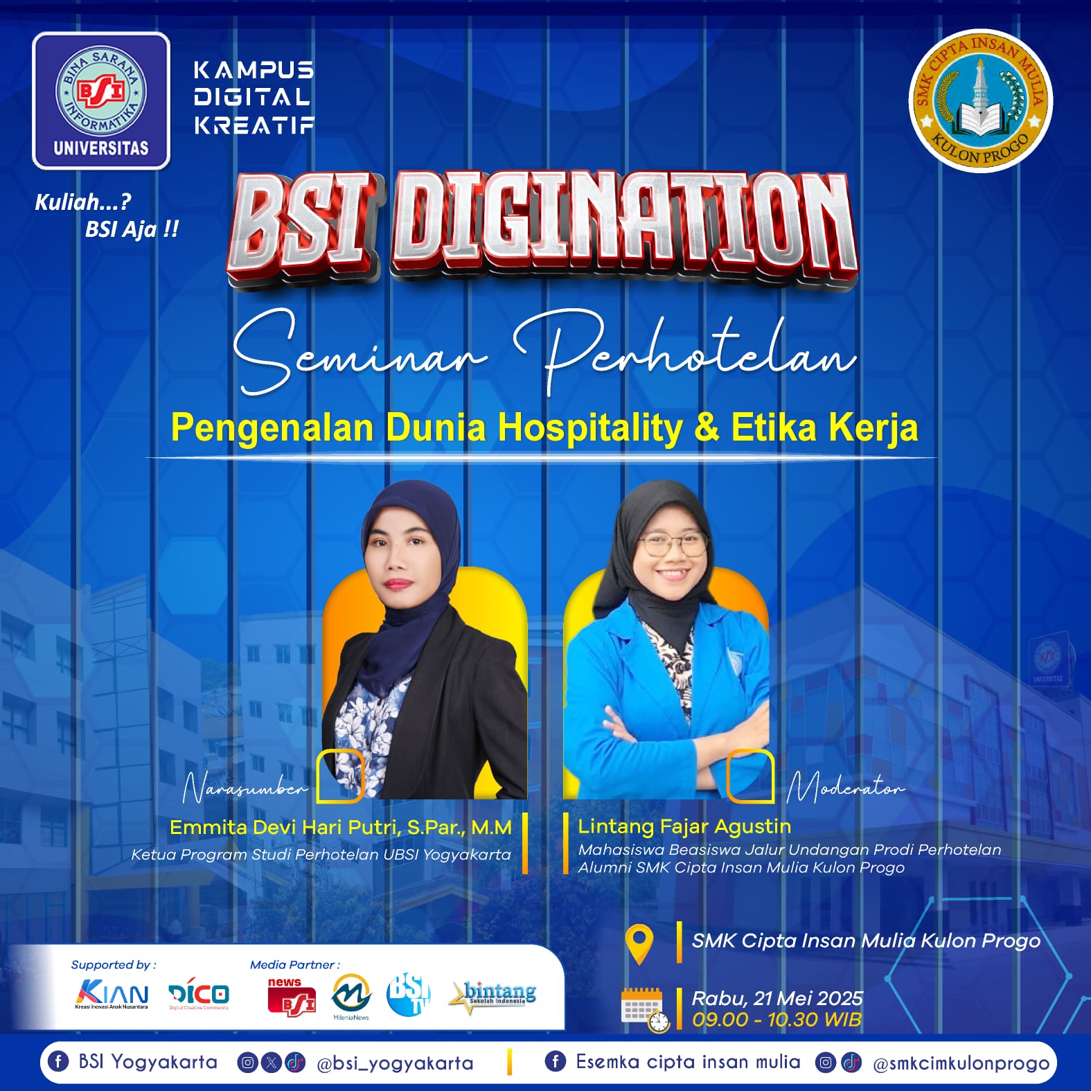 Acara juga akan dipandu oleh Lintah Fajar Agustin, mahasiswa aktif UBSI Kampus Yogyakarta yang merupakan alumni SMK CIM. Kehadirannya diharapkan dapat menjadi inspirasi nyata bagi adik-adik kelasnya dalam meraih impian melalui pendidikan tinggi. Kegiatan ini menjadi bentuk kolaborasi strategis antara UBSI dan sekolah mitra dalam menyiapkan generasi pelajar yang tidak hanya cerdas secara akademik, namun juga memiliki karakter unggul dan kesiapan kerja yang kuat.