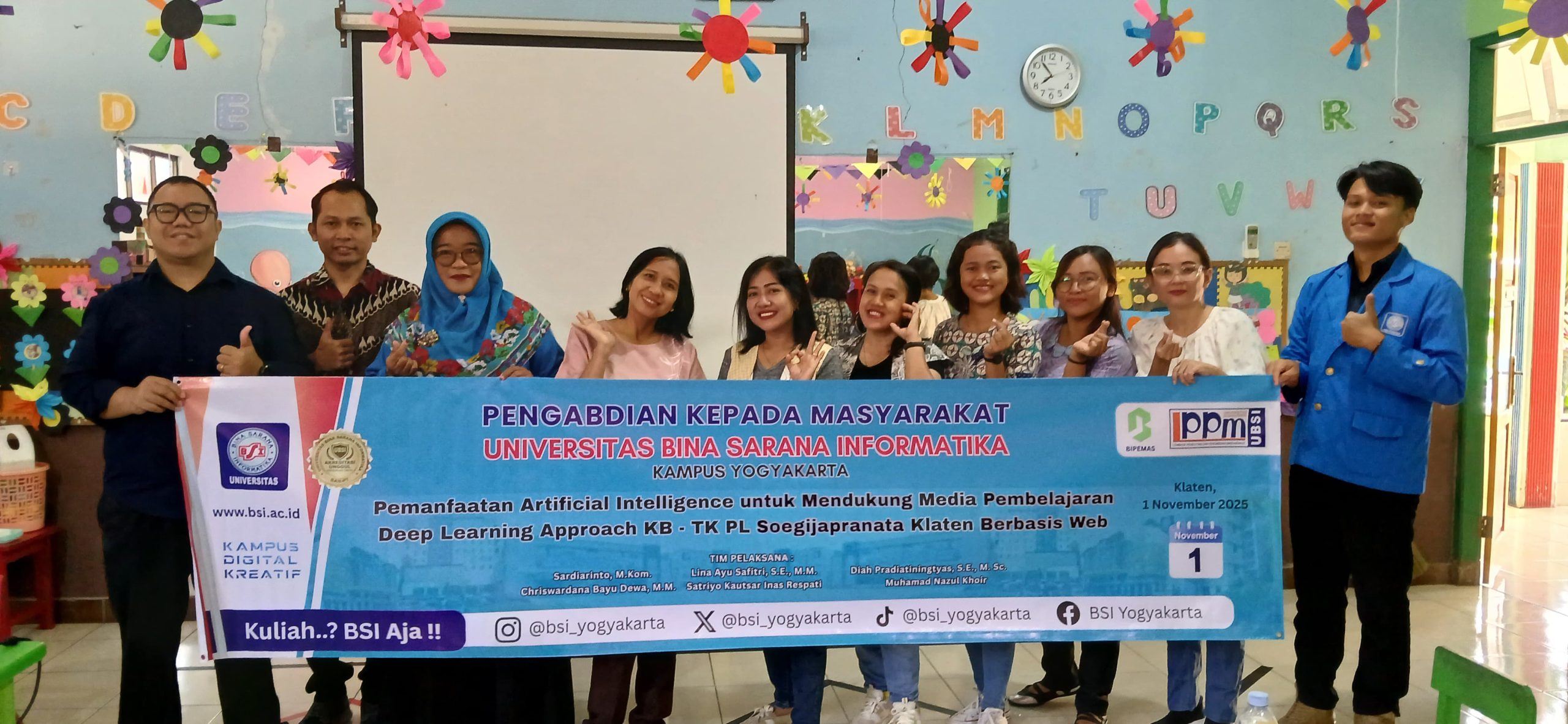 Klaten, 1 November 2025 — Universitas Bina Sarana Informatika (UBSI) Kampus Yogyakarta dan Solo kembali menunjukkan komitmennya dalam menerapkan Tri Dharma Perguruan Tinggi melalui kegiatan Pengabdian kepada Masyarakat (PkM). Kegiatan ini dilaksanakan di KB-TK PL Soegijapranata Klaten dengan tema “Pemanfaatan Artificial Intelligence untuk Mendukung Media Pembelajaran Deep Learning Approach Berbasis Web.”