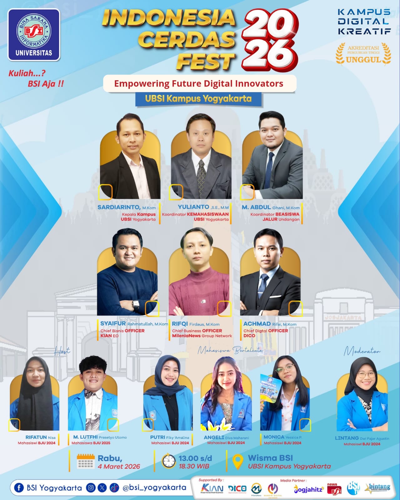 Universitas Bina Sarana Informatika (UBSI) Kampus Yogyakarta melalui Program Beasiswa Jalur Undangan (BJU) akan menyelenggarakan Seminar Indonesia Cerdas Fest 2026 bertajuk “Empowering Future Digital Inovator”. Kegiatan ini akan dilaksanakan pada Rabu, 04 Maret 2026 pukul 13.00 – 18.30 WIB bertempat di Wisma UBSI Yogyakarta, Jl. Ringroad Barat, Gamping, Sleman.