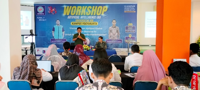 Universitas Bina Sarana Informatika (UBSI) Kampus Kota Yogyakarta menyelenggarakan Workshop AI dengan tema “Pemanfaatan Aplikasi Canva dengan Bantuan AI untuk Membuat Media Pembelajaran” pada hari Rabu, 18 Februari 2024, bertempat di Wisma BSI Yogyakarta. Workshop ini bertujuan untuk meningkatkan kreativitas guru SMA/SMK di Yogyakarta dalam membuat media pembelajaran yang menarik dan interaktif dengan bantuan AI. Narasumber workshop ini adalah Bapak Fabriyan Fandi, M.Kom, seorang dosen, konten kreator, dan digital marketing, serta Bapak Ahkmad Syukron, M.Kom, sebagai asisten pemanfaatan AI. Workshop ini dihadiri oleh lebih dari 50 guru SMA/SMK di daerah Istimewa Yogyakarta. Dibuka dengan sambutan dari Dekan Fakultas Ekonomi dan Bisnis Universitas Bina Sarana Informatika, ibu Dr. Ani Wijayanti, SE, MM, yang menekankan pentingnya teknologi masa kini untuk generasi Z. Kemudian, Kepala Kampus UBSI Kampus Kota Yogyakarta, berkesempatan menyampaikan informasi beasiswa pendidikan di UBSI. “Banyak kesempatan bagi peserta didik SMA/SMK untuk memperoleh beasiswa dengan jalur undangan dan jalur prestasi yang dapat mencapai 100% di UBSI”, Ujar bapak Fadlya Ma’arif, M.Kom.