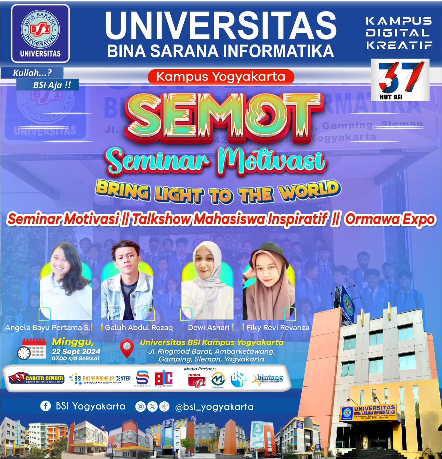 Universitas BSI Kampus Yogyakarta akan menggelar SEMOT (Seminar Motivasi) dan Talkshow Inspiratif pada hari Minggu, 22 September 2024. Acara ini bertema “Bring Light to The World,” yang bertujuan untuk menginspirasi dan memotivasi mahasiswa baru UBSI Yogyakarta 2024.